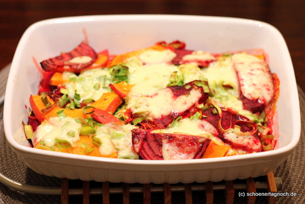 So blieb jedenfalls noch einiges Gemüse übrig. Aber bei mir kommt nichts weg, und das übrige Gemüse habe ich am nächsten Tag zu einem herbstlichen Ackersalat mit Roter Bete, Kürbis und Ziegenfrischkäse verarbeitet. Mit einem Orangen-Olivenöl-Dressing und cremigem Ziegenfrischkäse dazu haben mir die Reste des Herbstgratins gut geschmeckt.