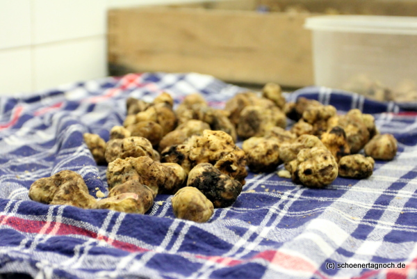 Und natürlich habe ich mir auch einen schwarzen und einen weißen Alba-Trüffel mit nach Hause gepackt – sicher verpackt in einem luftdichten Behälter. Ich weiß nämlich nicht, wo in Karlsruhe ich Trüffel kaufen könnte – schon gar nicht in dieser Qualität. Da habe ich es dann gerne in Kauf genommen, dass mein Handgepäck dezent nach Trüffel gemüffelt hat und ich meinen kleinen Koffer wegen des darin enthaltenen, höchst gefährlichen Trüffel-Hobels doch am Gepäckschalter aufgeben musste! Aber das war es wert, wie ihr  in den nächsten Tagen sehen werdet, wenn ich meine Trüffel-Gerichte auf dem Blog veröffentliche – versprochen!